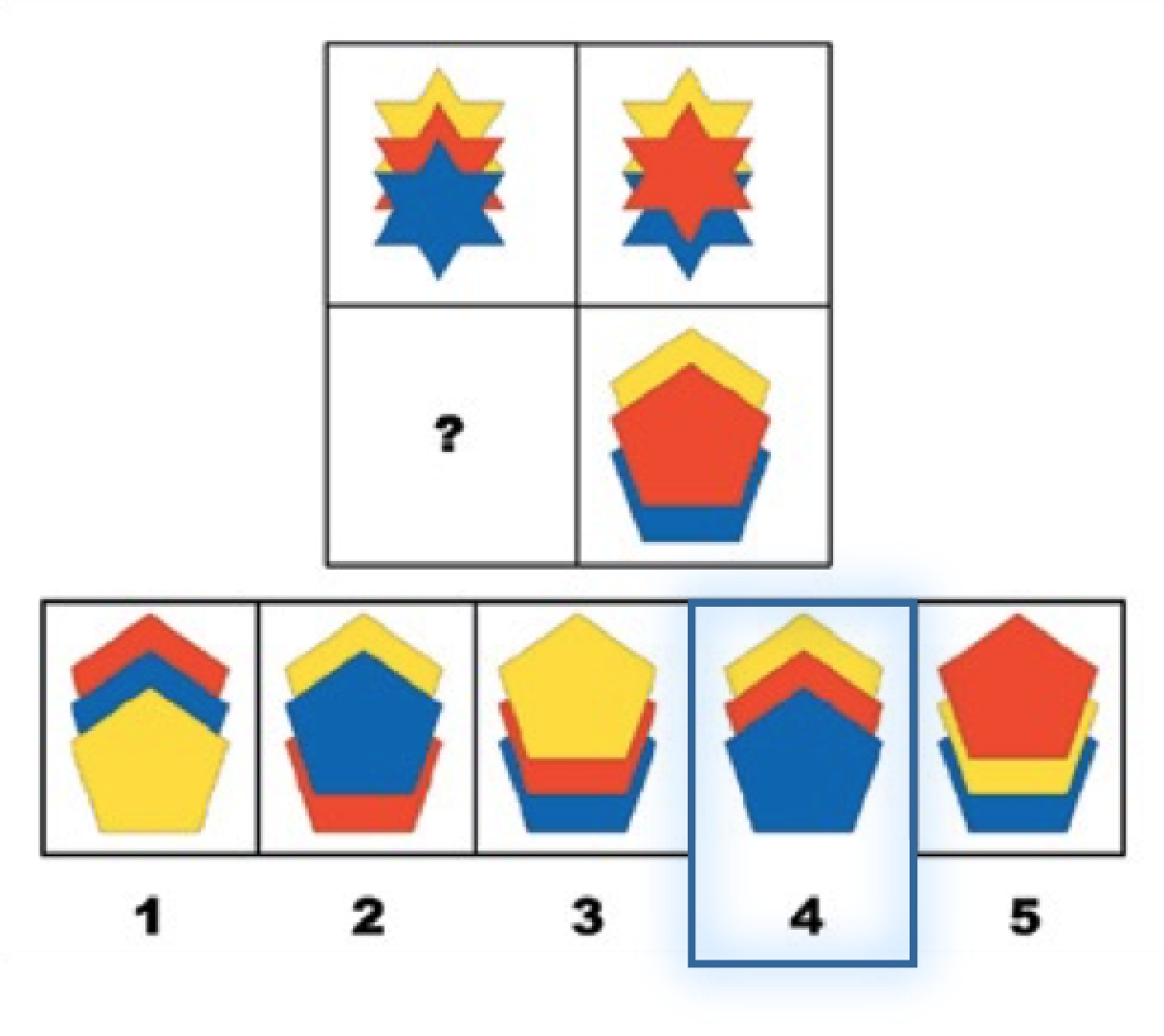 une série de figures géométriques est présentée et il retrouver la figure qui complète logiquement la suite parmi cinq possibilités