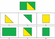 une figure géométrique est éclatée en trois morceaux qu’il faut retrouver parmi un choix de six propositions