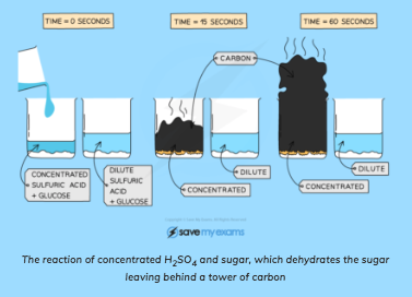 For example, if mixed with sugar (C6H12O6), concentrated H2SO4 will remove water molecules and leave behind carbon in a spectacular looking reaction that produces a tower of pure carbon.