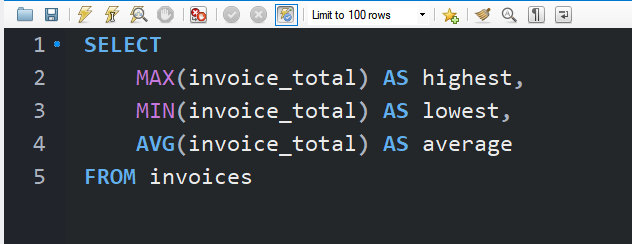 the max, min, and avg values as highest, lowest, average of the invoice total on the invoices table