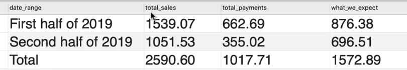 SUM(invoice_total - payment_total) AS what_we_expected