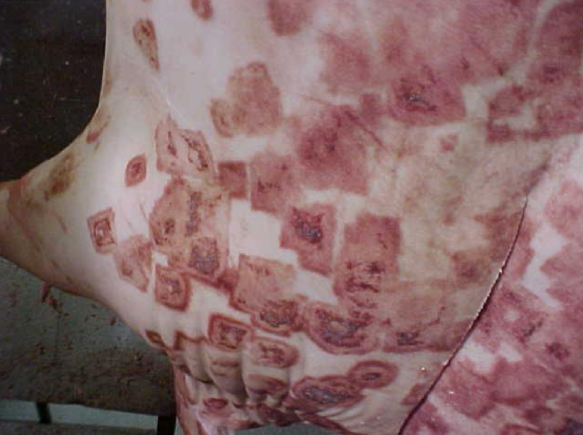 What clinical sign in boars is suggestive of Brucella suis?