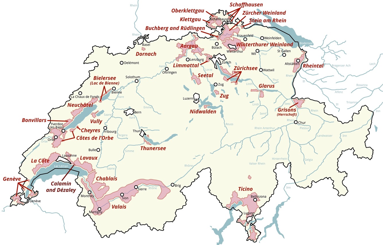Which canton contains the densest plantings of vineyards in Switzerland?