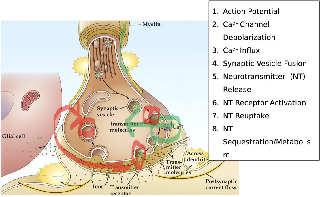 Can be excitatory (i.e., increasing the possibility of causing an action potential in the post-synaptic neuron) or inhibitory (i.e., decreasing the probability of an action in the postsynaptic neuron)