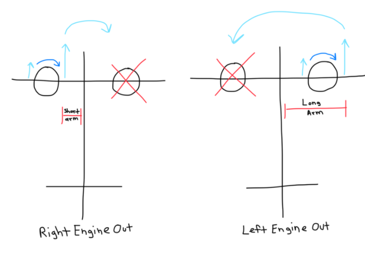 failure of the left engine will cause MORE loss of directional control, than the loss of the right engine b/c of the LONGER ARM of the right (operative) engines arm’s thrust causing a/c to yaw.