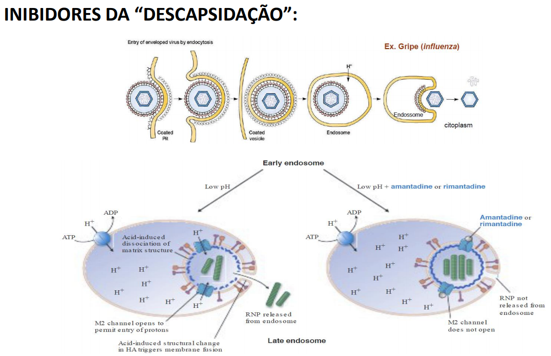 2) Libertação do genoma viral: Proteína viral M2 (canal iónico) permite o influxo de protões para dentro do endossoma. Há acidificação do meio que destrói a cápside e liberta o material genético. A NA tem um papel essencial depois da replicação do virião: permite a ruptura da ligação entra a HA e o ácido siálico quando há libertação do virião.