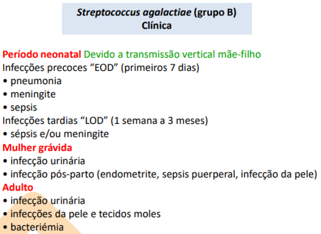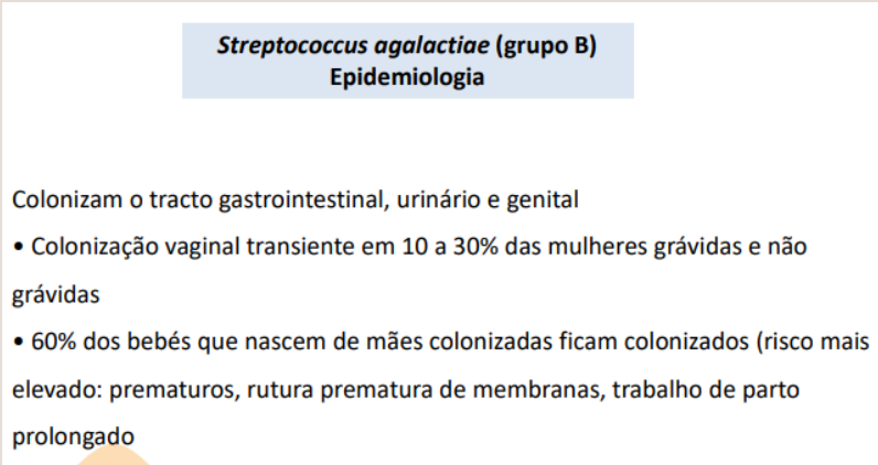 Coloniza trato GI, urinário e genital (30% mulheres têm S. agalactiae na vagina). Agente neonatal - 60% bebés de mãe colonizada ficam colonizados.