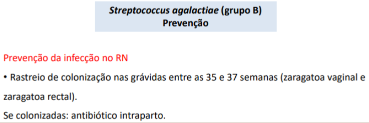 Rastreio obrigatório grávidas às 35/37 semanas. Se estiverem colonizadas, faz-se antibioterapia intraparto.