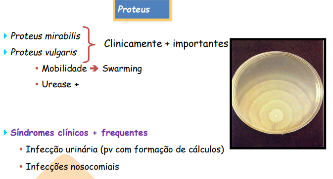 Swarming -> muita mobilidade (SÓ em gelose sangue, inibido em MacConkey. No MacConkey forma colónias isoladas o que permite estuda-lo)