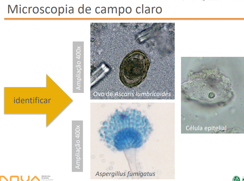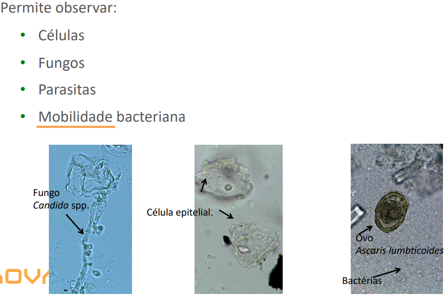 Só conseguimos caracterizar os MO em grandes ampliações e por isso corados. No exame a fresco permite vê-los ma não caracteriza-los, a não ser que sejam MO grandes como na figura em anexo.