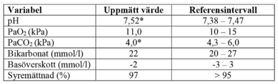 Fråga1:1 (3p) Tolka och ange en trolig orsak till resultatet av artärblodgasanalysen. Motivera!