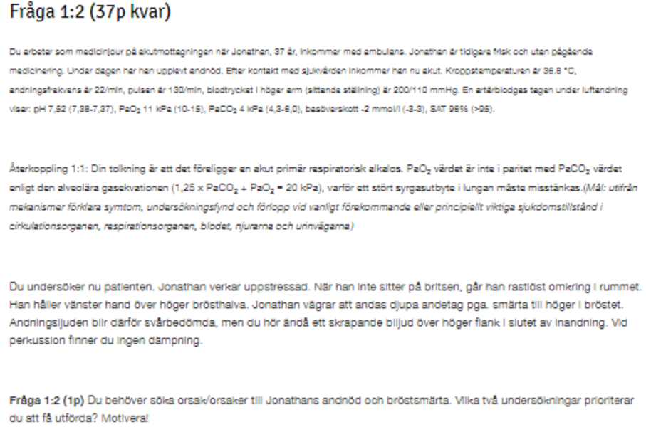 Du arbetar som medicinjour på akutmottagningen, när Jonathan, 37 år, inkommer med ambulans. Jonathan är tidigare frisk och utan pågående medicinering. Under dagen har han upplevt andnöd. Efter kontakt med sjukvården inkommer han nu akut. Innan du själv träffar Jonathan har annan vårdpersonal gjort en första bedömning av Jonathans vitalparametrar. En artärblodgas, tagen på luftandning (utan tillsatt syrgas), är också analyserad. Du tar del av följande resultat: Kroppstemperatur: 36.8 °C