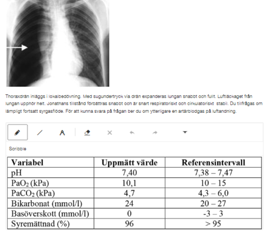 Du arbetar som medicinjour på akutmottagningen när Jonathan, 37 år, inkommer med ambulans. Jonathan är tidigare frisk och utan pågående medicinering. Under dagen har han upplevt akut påkommen andningskorrelerad högersidig bröstsmärta och andnöd. Du hör ett skrapande biljud över högerflank i slutet av varje inandning. Perkussion är utan dämpning. Du beställer ett Ekg och en lungröntgen. Du har precis ordnat röntgenremissen, när larmet går. Jonathan är nu akut sviktande i andning och cirkulation. En ventilpneumothorax på höger sida bekräftas med en akut lungröntgen. Ett thoraxdrän inlägges i lokalbedövning. Med sugundertryck via drän expanderas lungan helt och luftläckaget från lungan upphör. Jonathan förbättras snabbt.