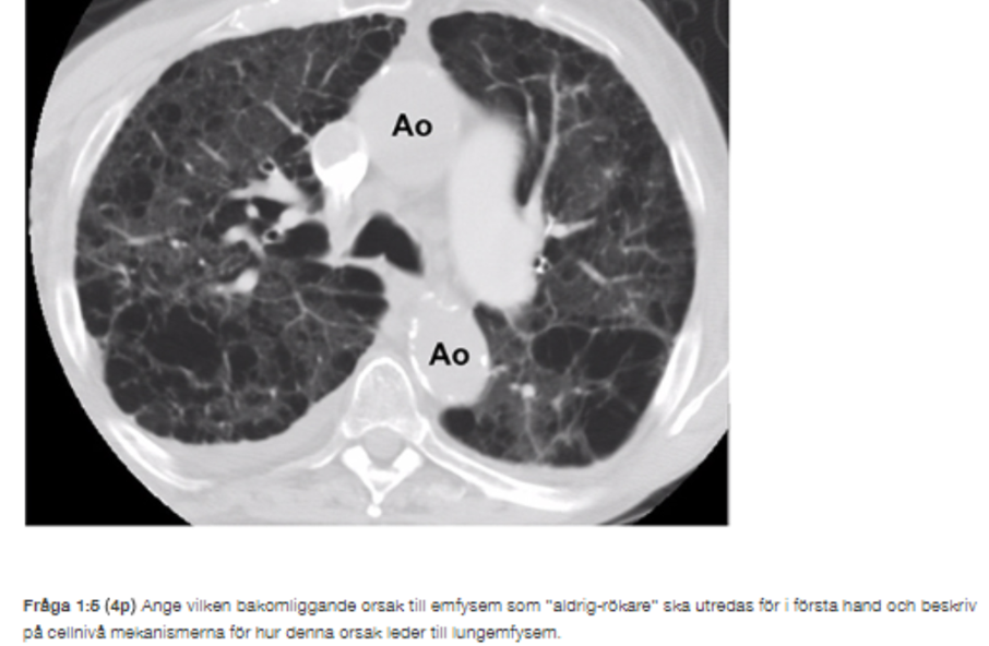 När en tidigare komprimerad lunga, som är tom på luft, snabbt expanderas kommer tidigare komprimerad kärlbädd i lungan att öppna upp sig. När blodcirkulationen så plötsligt återställs finnsd et risk för vätskeutträde från kapillärer in i lungans vävnader och ut i lungans alveoler. Ett så kallat re-expansionslungödem kan uppträda i höger lunga. Tillståndet är mycket allvarligt. En akut datortomografi (DT) av thorax visar dock inga sådana tecken. Den relativa hypoxemin förklaras istället av ett emfysem (se bild). Eftersom Jonathan är ”aldrigrökare” blir du överraskad att han har ett så avancerat emfysem med så stora blåsor. Med tanke på Jonathans unga ålder blir du också överraskad att hans aorta(Ao)vägg redan är så pass förkalkad (se bild)