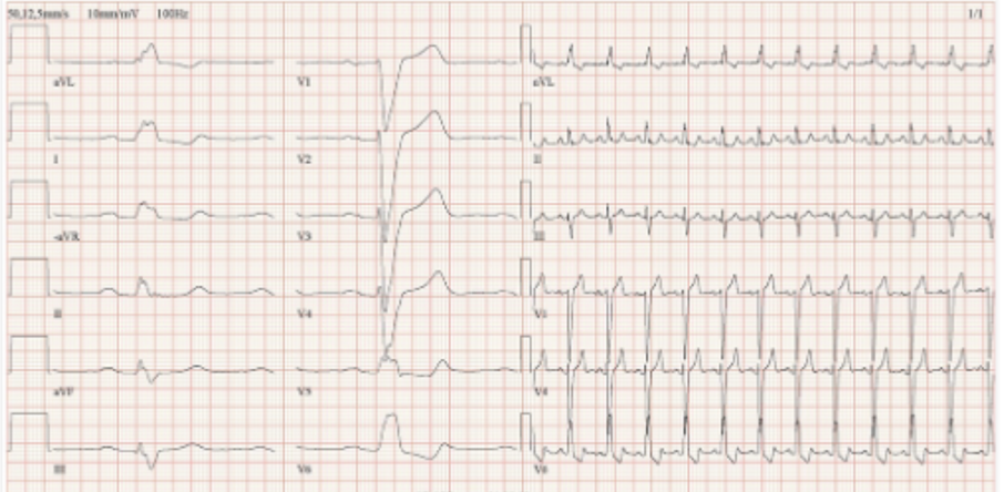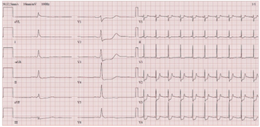 Du tar fram EKG linjalen och mäter: Sinusrytm ca 55-60/min. P-vågor med utseende som vid p-mitrale. PQ-tid ca 130-140ms. QRS-komplex med bredd ca 80ms. El-axel 0-30 grader. Tydliga ST-sänkningar i V1-V4 (och mer diskreta i inferiora extremitetsavledningar). Bröstsmärtor och ST-sänkningar. Din första tanke är att det kan vara en NSTEMI (Icke-ST-höjningsinfarkt) men så kommer du att tänka på att en viss typ av STEMI (ST-höjningsinfarkt) kan yttra sig på detta sätt på EKG.