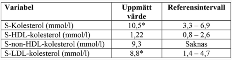 Jonathan genomgår komplikationsfritt PCI mot circumflexagrenen av vänster kranskärl (LCx) och vårdas nu på en hjärtavdelning. Enligt rutin vid akut hjärtinfarkt tas fastande lipidprover på morgonen nästkommande dag. Svaren kommer lagom till förmiddagsronden (vg se tabell nedan).