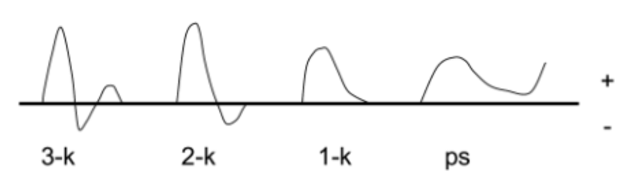 Positivt monofasiskt (1-k) flödesprofil vid högre perifert flödesmotstånd och/eller dämpat positivt pulserande flöde genom hela hjärtcykeln vid samtidig kompensatorisk perifer vasodilatation (ps i figuren).Den normala retrograda flödeskomponenten försvinner vanligtvis distalt om uttalade perifert artärflödeshinder eftersom utgående pulstryckvågen inte växer i perifer riktning utan dämpas och den reflekterande tryckvågskomponent försvagas.