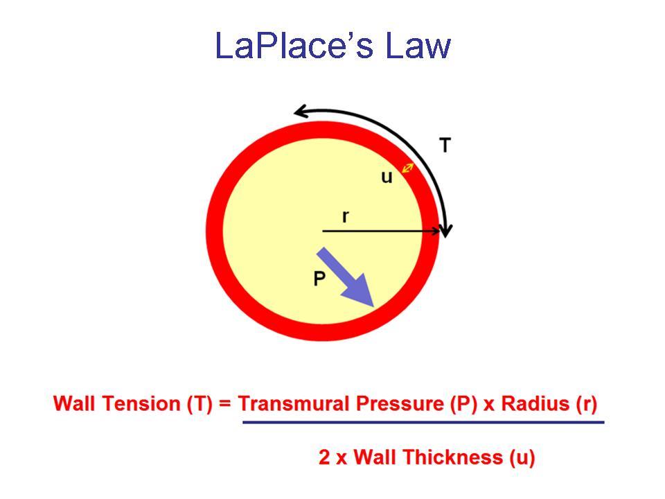 Väggtensionen ökar med radien enligt LaPlaces lag: T = P * R, där (T) är väggtension, (P) är tryck och R är radie.
