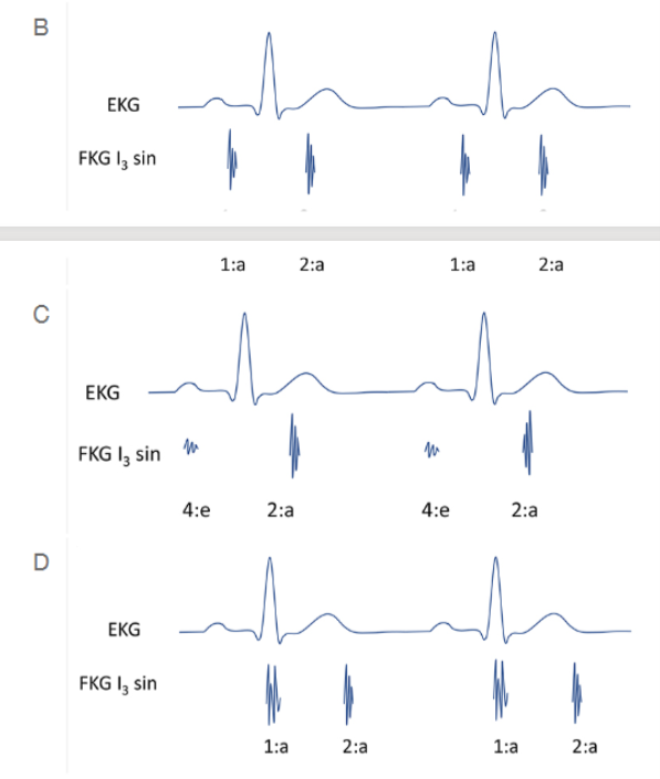 Fråga 1:2 (1p) Nedan visas fyra olika skisser där EKG-signal samt hjärtljud skall ha registrerats simultant, det senare med fonokardiogram (FKG). Markera det svarsalternativ därför hållandet mellan EKG-signal och hjärtljud är mest korrekt!
