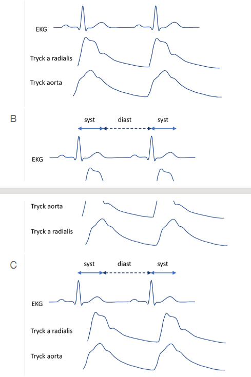 Nedan ses fyra skisser (A-D) som visar EKG-signal och pulstryckvågor med hjärtcykelfas markerat. Markera det svarsalternativ där förhållandet dem emellan är mest korrekt!