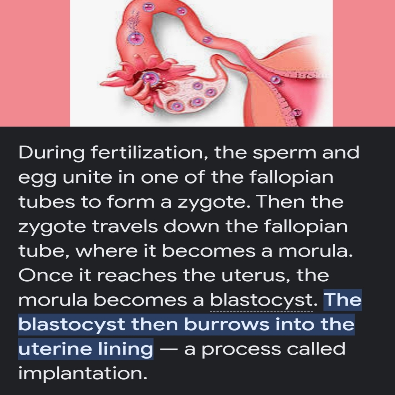 Fertilization, zygote, morula, blastocyst, implantation, development of chorionic villi