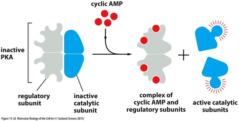 PKA. Needs 4 cAMP molecules to bind before it releases its two active subunits