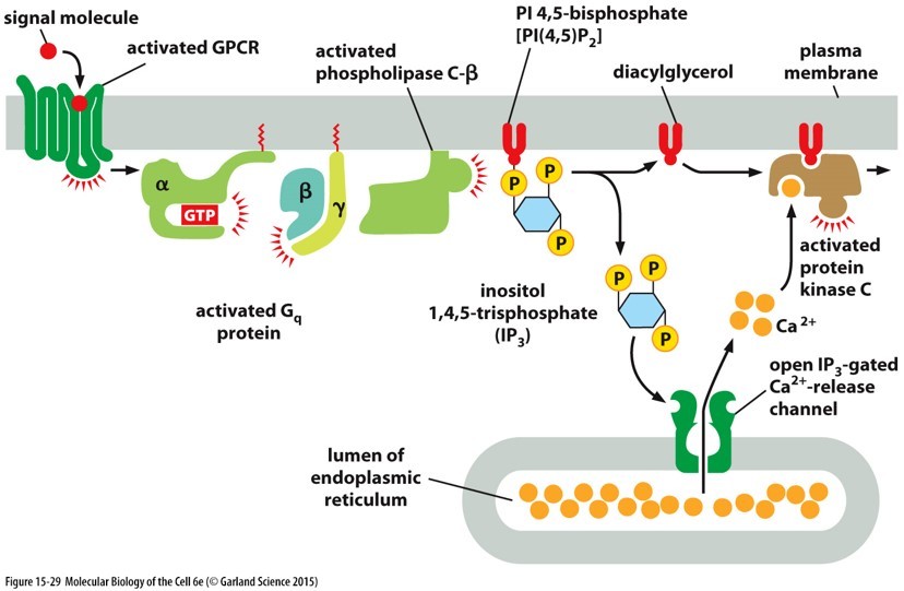 C), IP3 goes down to the ER and binds to open calcium channels, creating calcium waves that activate PKC if diacylglycerol is also bound