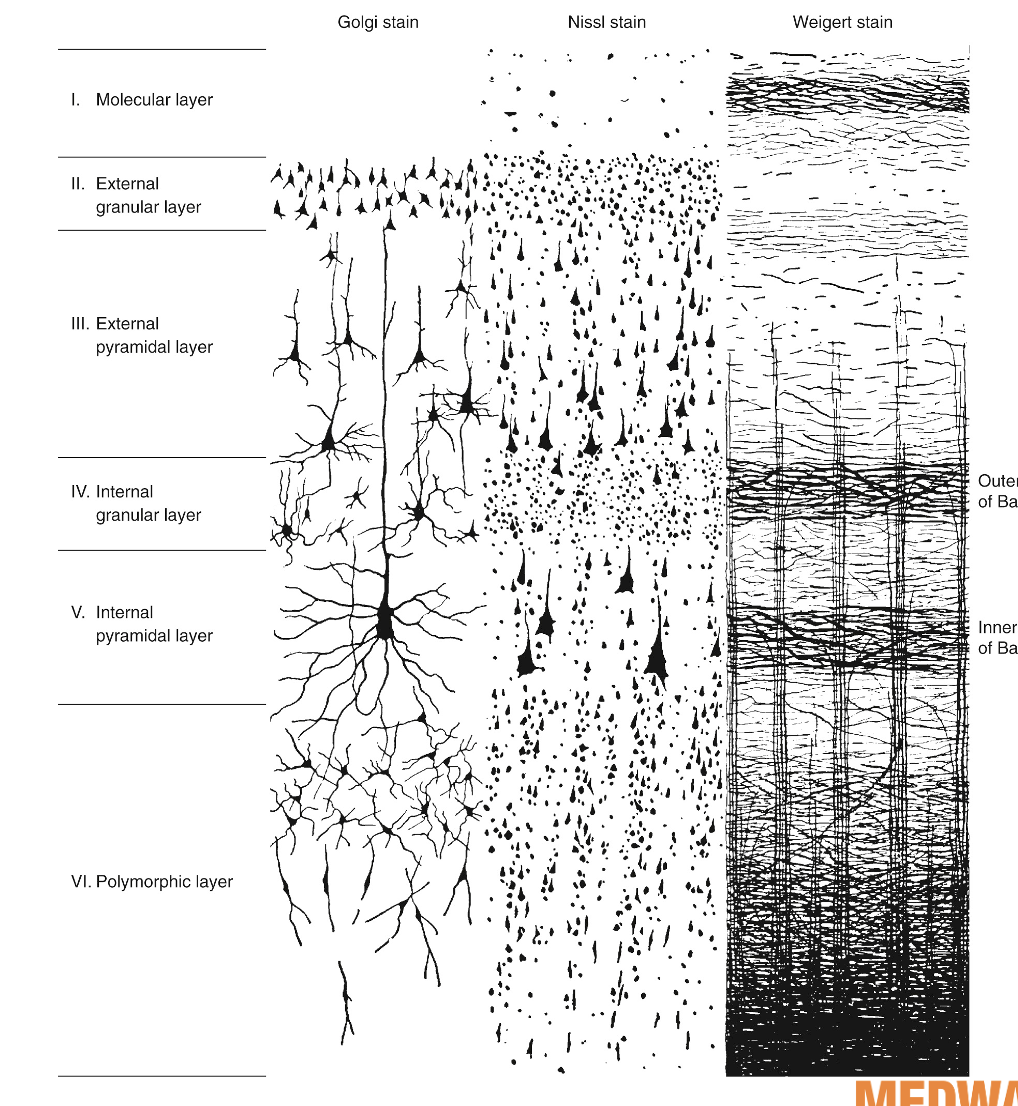 In relation to inside out cortical development neurons are formed in the ventricle zone (lining of ventricular system) and migrate to the cortical (cortex) area. How many layers of cells are in the cortical area?