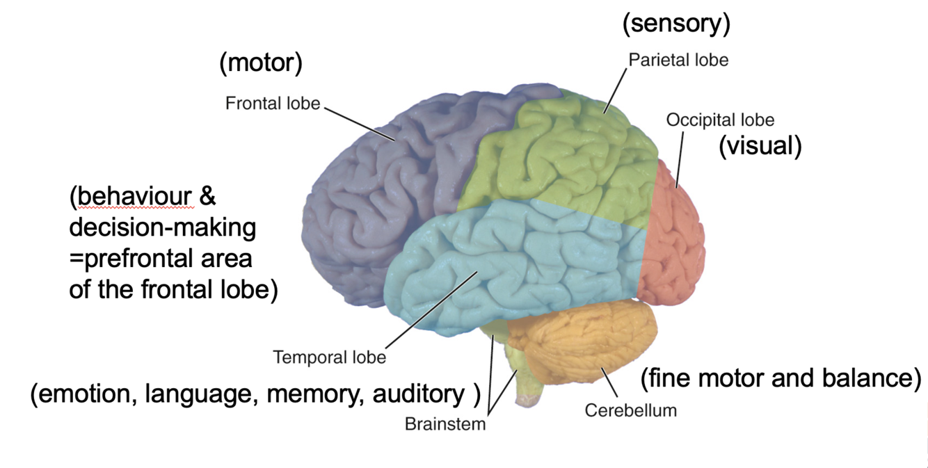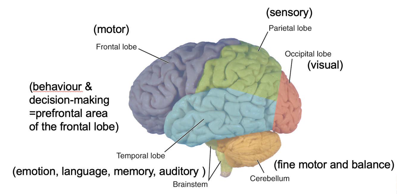 Which lobe of the brain is heavily involved in motor control, behaviour and decision-making?