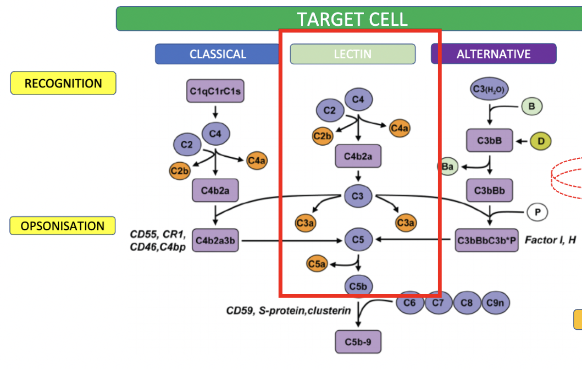Only diff is recognition: not done through Abs/pentraxins/lipids but instead via atypical glycosylation (sugars!) on pathogen surface