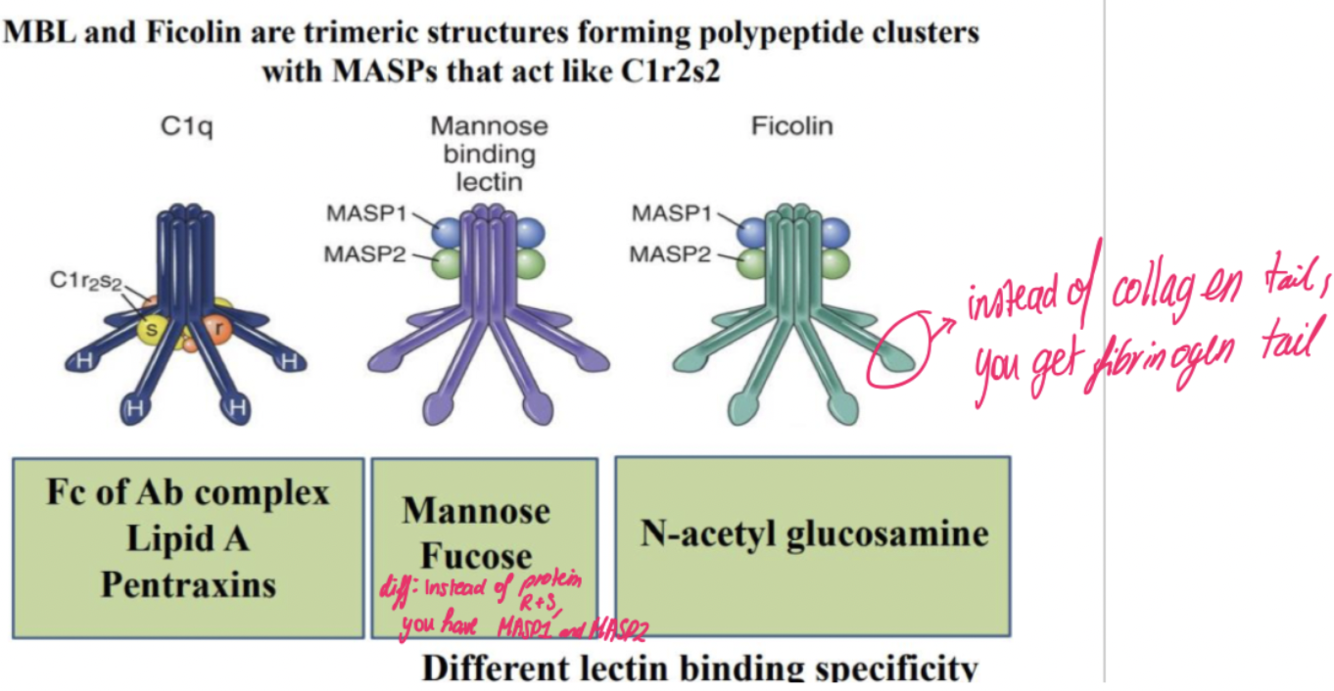 Ficolins: recognize and bind to acetyl groups present on microbe surface. Ficolins also associate w MASPs