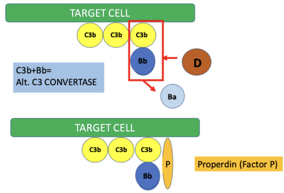 C3 convertase= unstable here, so factor P (properdin) stabilises it.