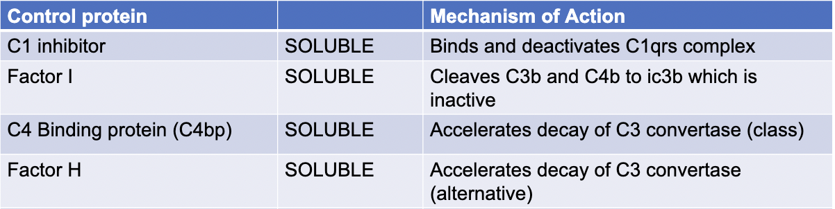 Explain the mechanism of action of the control proteins of C1i, Factor I, C4bp, Factor H