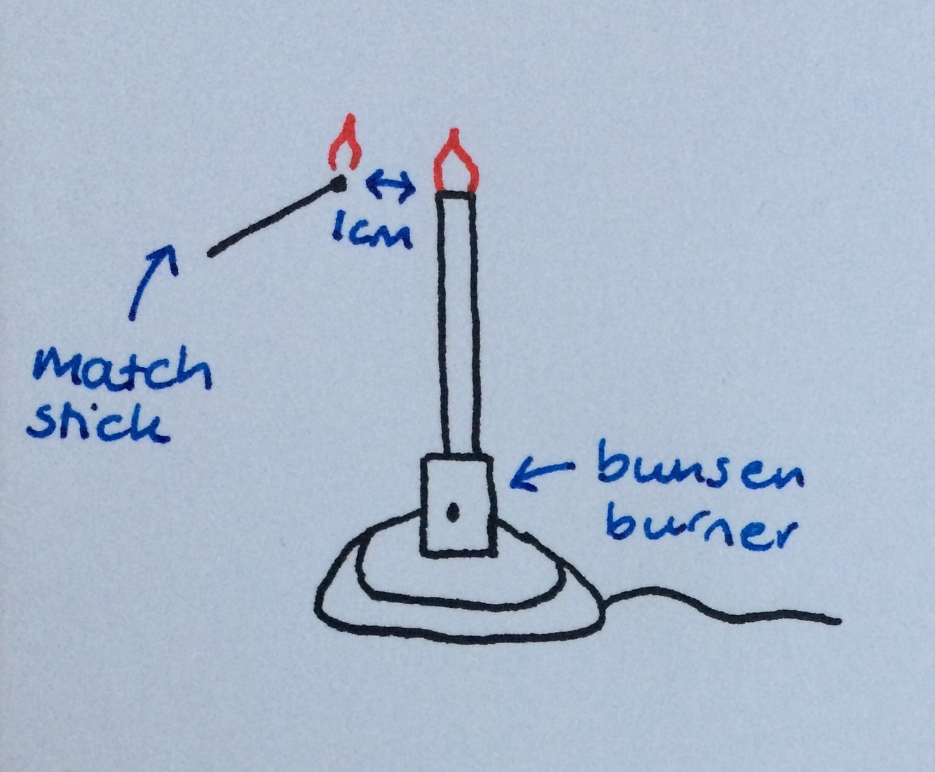 the matchstick must be held 1cm away from the Bunsen Burener to ignite