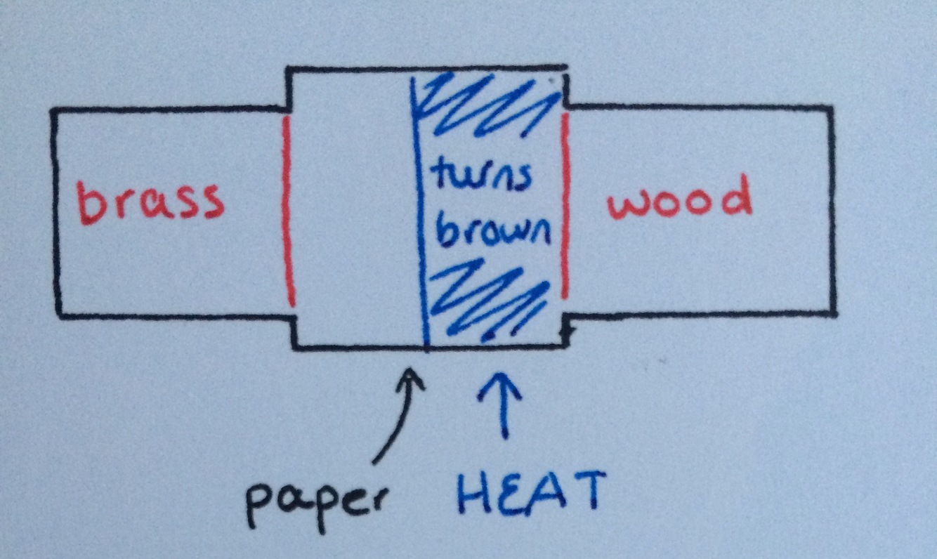 because metals are good at conducting heat, the brass conducts heat away from the centre - the paper does not get too hot and does not turn brown (get burnt)