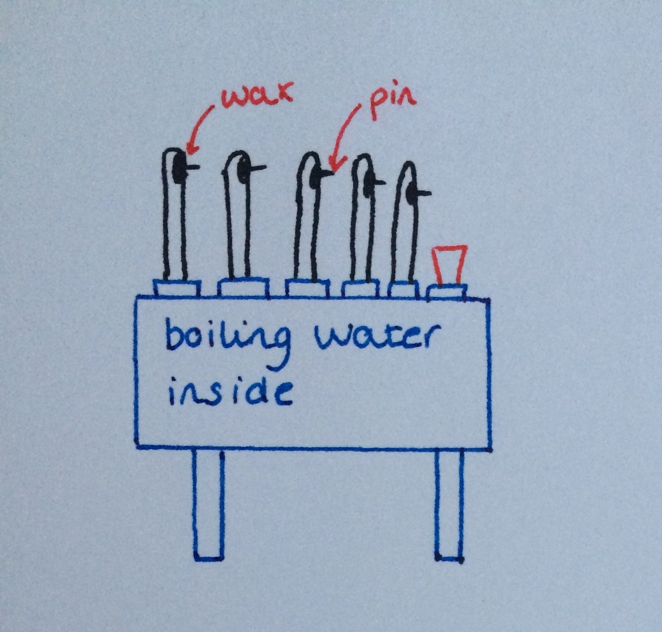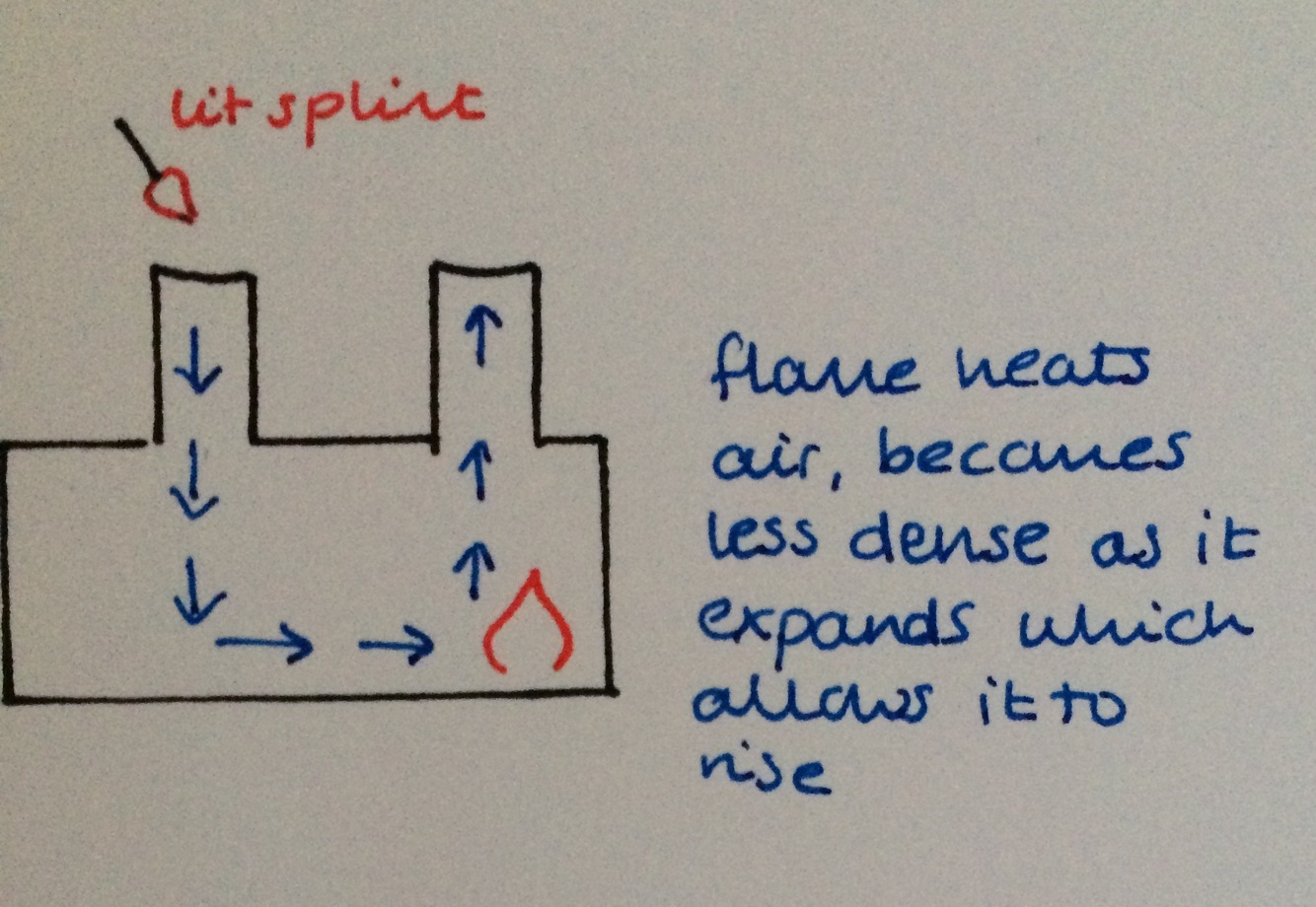 the smoke enters, goes through the bottom compartment, reaches a candle (minera) and out the other tube