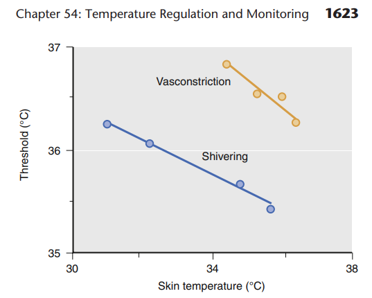 The relationship between skin temp and core temp triggering vasoconstriction and sweating is _