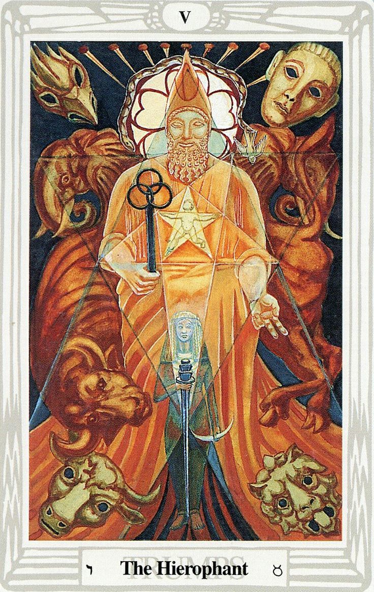 Eventually, the Fool ventures out of his home into the wider world. He is exposed to the beliefs and traditions of his culture and begins his formal education. The Hierophant (5) represents the organized belief systems that begin to surround and inform the growing child.