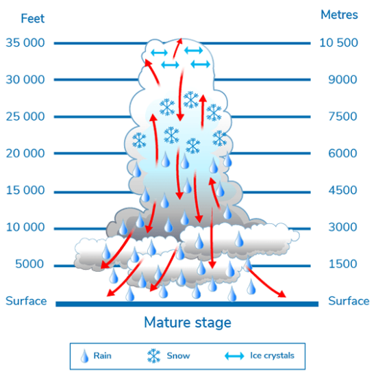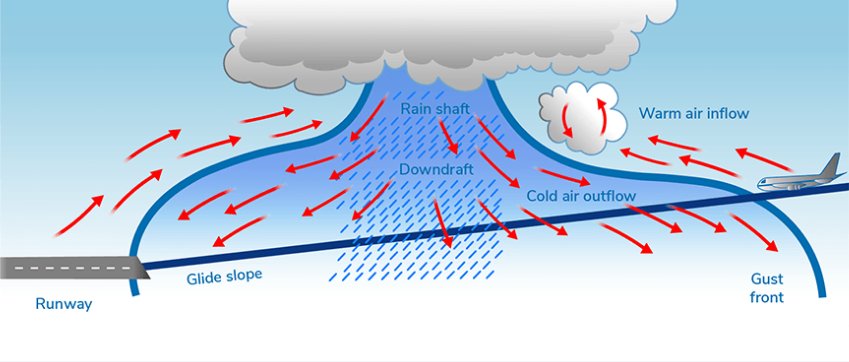 strong downdrafts in the mature stage of a thunderstorm reaching the ground and spreading out horizontally