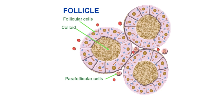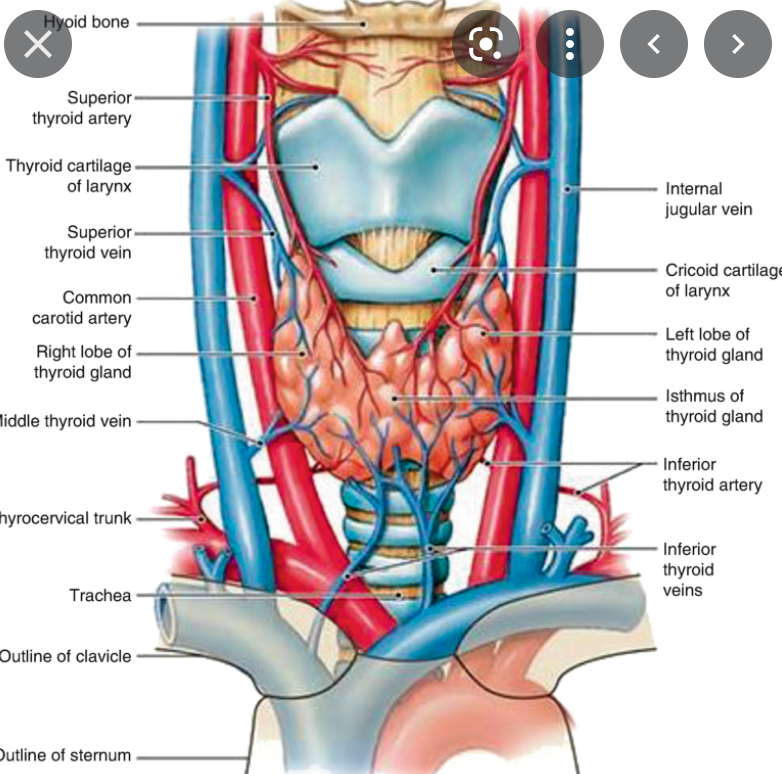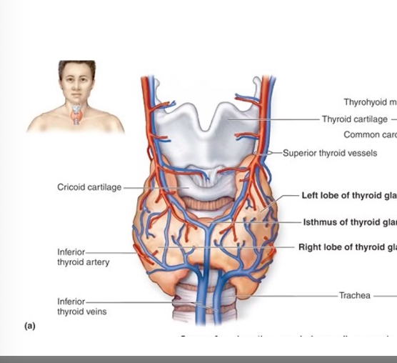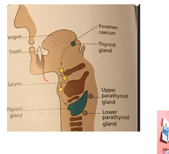it begins to develop at the base of the tongue and descends down to infront of the tracheal rings and meets the parathyroid glands