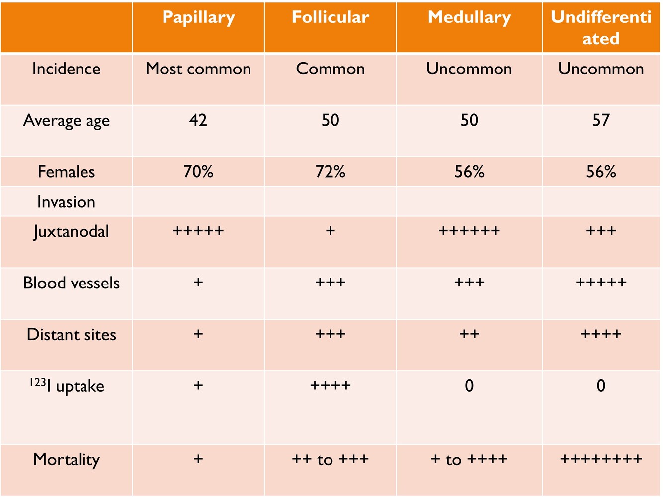 papillary vs follicular vs medullary vs undifferentiated