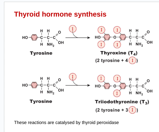 Synthesises the Thyroid Hormones of which there are two physiologically active forms: T3 (triiodothyronine) and T4 (thyroxine).