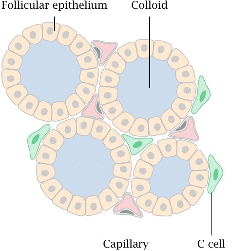 Parafollicular C cells are dispersed rarely