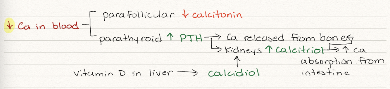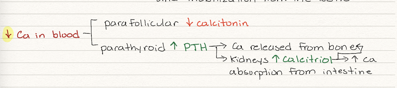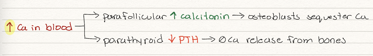 Parafollicular cells in thyroid increase calcitonin –> osteoblasts sequester Ca