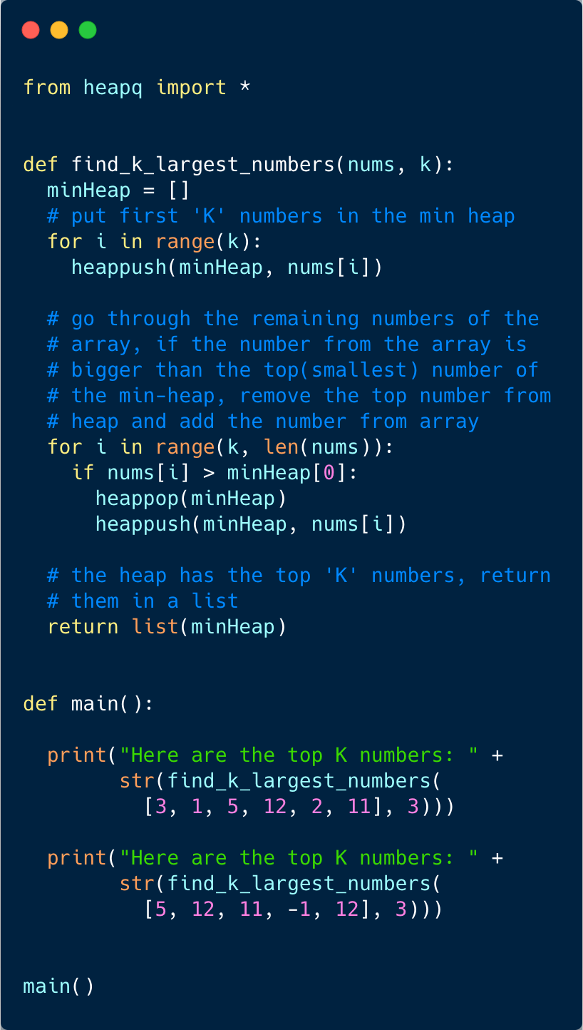 The space complexity will be O(K) since we need to store the top ‘K’ numbers in the heap.