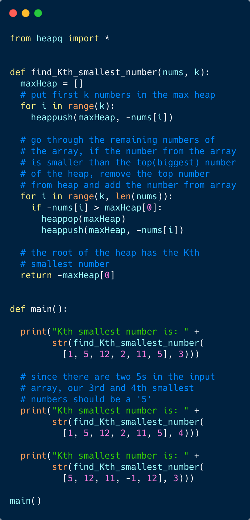 1. Here we need to find the Kth smallest number, whereas in Top ‘K’ Numbers we were dealing with ‘K’ largest numbers.