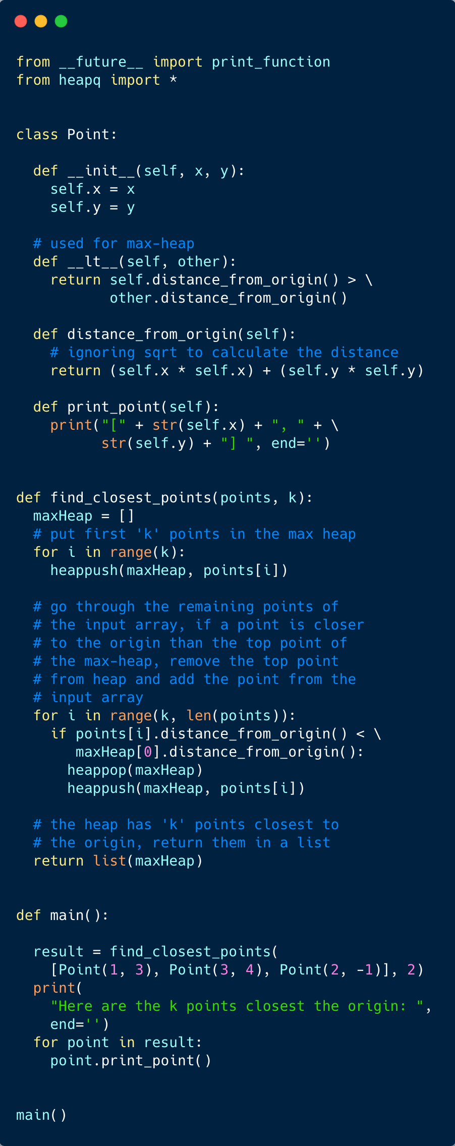 Following a similar approach, we can use a Max Heap to find ‘K’ points closest to the origin. While iterating through all points, if a point (say ‘P’) is closer to the origin than the top point of the max-heap, we will remove that top point from the heap and add ‘P’ to always keep the closest points in the heap.