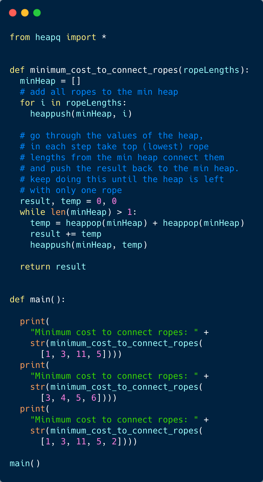 In this problem, following a greedy approach to connect the smallest ropes first will ensure the lowest cost. We can use a Min Heap to find the smallest ropes following a similar approach as discussed in Kth Smallest Number. Once we connect two ropes, we need to insert the resultant rope back in the Min Heap so that we can connect it with the remaining ropes.