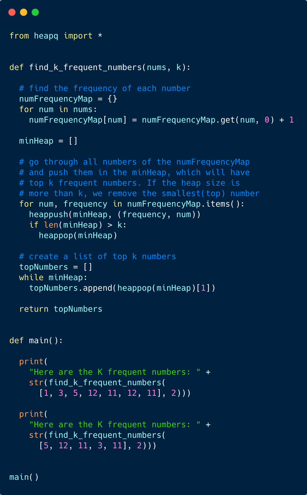 We can follow the same approach as discussed in the Top K Elements problem. However, in this problem, we first need to know the frequency of each number, for which we can use a HashMap. Once we have the frequency map, we can use a Min Heap to find the ‘K’ most frequently occurring number. In the Min Heap, instead of comparing numbers we will compare their frequencies in order to get frequently occurring numbers