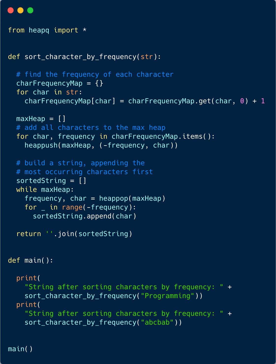 We can follow the same approach as discussed in the Top ‘K’ Frequent Numbers problem. First, we will find the frequencies of all characters, then use a max-heap to find the most occurring characters.